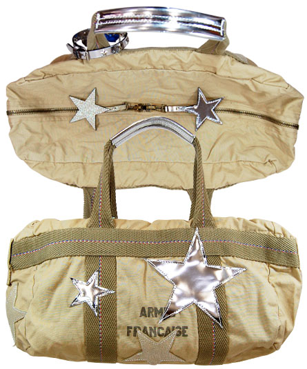 レプリカのフランス軍パラシュートバッグに、大小様々なメタリック革の星をパッチワークしたもの。