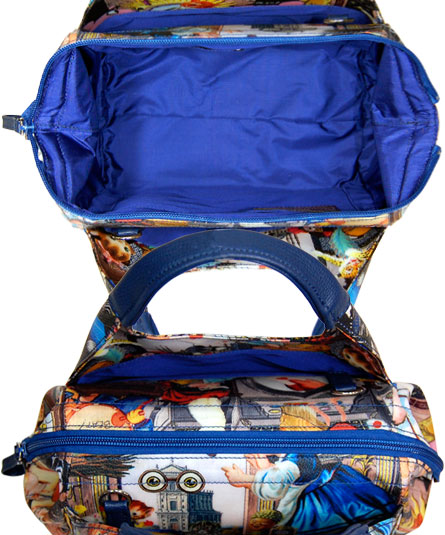 ブルーを基調としたプリント柄と、内装や手紐等の付属材料のブルーが、全体のアクセントカラーとして効いています。