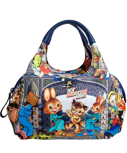 その中で子供や動物のキャラクターが楽し気に過ごす姿をコラージュしたファンタジックな世界が広がるプリントです。