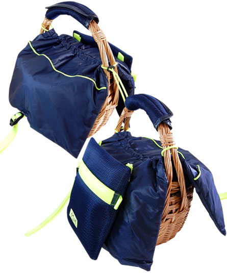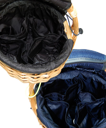 縦長の柳のカゴへ綿入りの薄手のナイロン生地のカブセを付けた冬用のカゴの提案です。