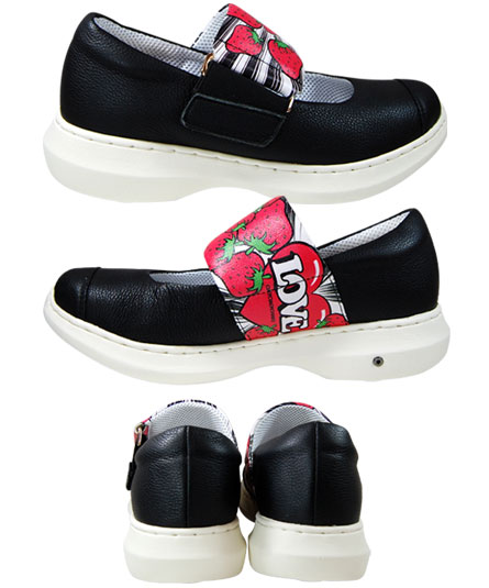 黒には、いちごと LOVE の文字のイラストが、茶にはきのこと YEAH の文字のイラストが牛革へプリントされています。