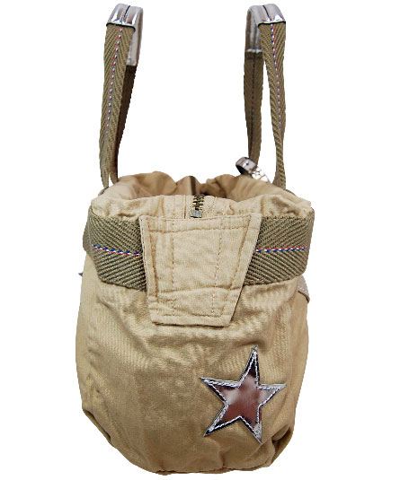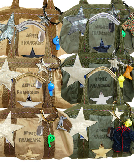 レプリカのフランス軍パラシュートバッグに、大小様々なメタリック革の星をパッチワークしたもの。