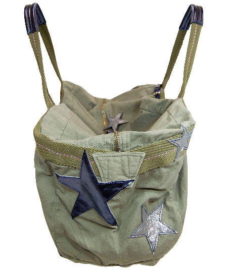 内装にポケット一つレプリカのフランス軍パラシュートバッグに、大小様々なメタリック革の星をパッチワークしたもの。