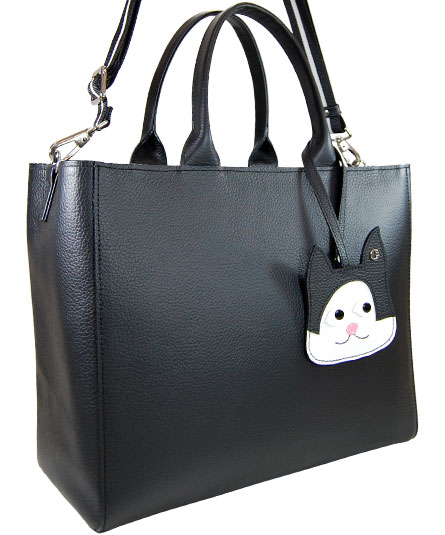 チャームは、革でパッチワークされた犬と猫が付いています。グレージュには犬、黒には猫になります。