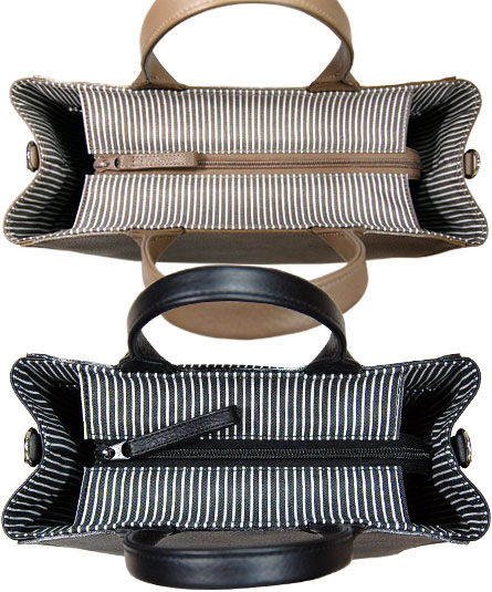 内装と背ポケットは、表に合わせたボーダーストライプ生地を使用。