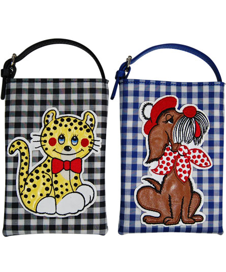 バックル金具で取り外しが出来る携帯ポーチは、レトロな昭和を感じさせるイラストのアップリケ刺繍(オリジナル)が施されています。