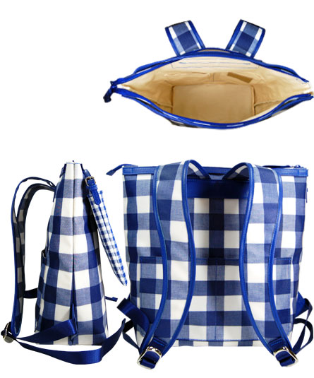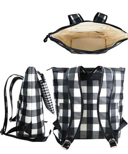 本体の大きなギンガムチェック柄の生地は、表面にビニールコーティングされていますので、汚れや多少の雨にも強いです。