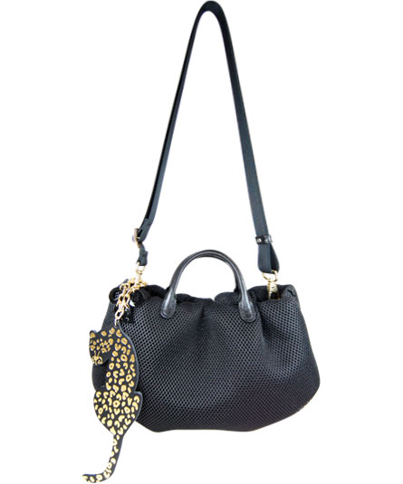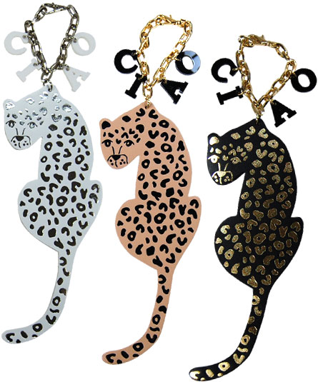 流行りの兆しのあるバッグチャームは、革製の豹のモチーフに、プラスティック製の「CIAO」の切り抜き文字がぶら下がったチェーンタイプ。