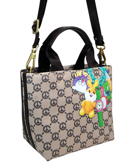 ティーンエイジャーが、チャームやマスコット等をバッグ一面に付けているイメージをプリントで起こしたトロンプルイユ(だまし絵)バッグ。
