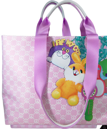 ティーンエイジャーが、チャームやマスコット等をバッグ一面に付けているイメージをプリントで起こしたトロンプルイユ(だまし絵)バッグ。
