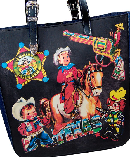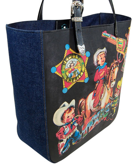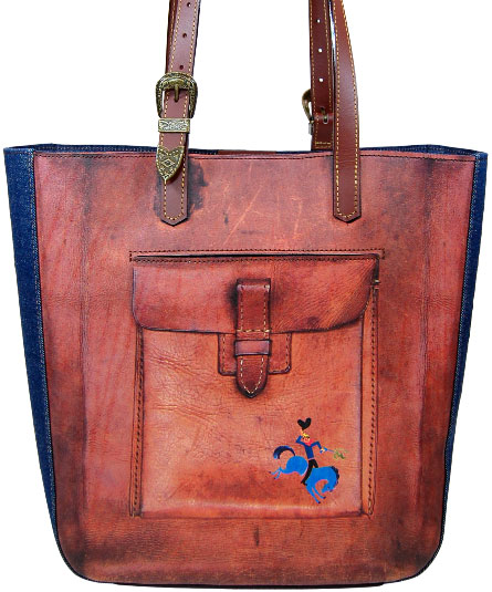 ヴィンテージの革のトートバッグをベースに、モチーフを貼り付けてプリントで再現したバッグです。