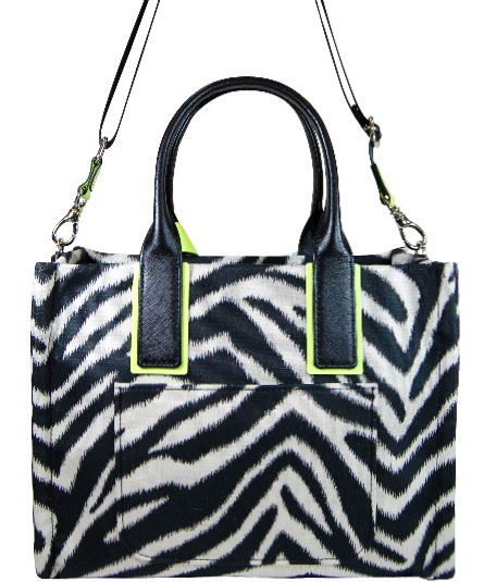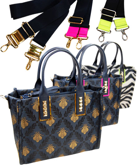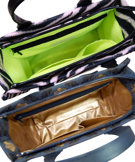 日本製のゼブラ柄とクラシカルな蜂のジャガード織りの生地を使ったシリーズ。 手紐込止め部分のスタッズ鋲、そして、ゴールド、シルバーのメタリック素材とピンク、イエローのネオンカラーがアクセントとして目を惹くデザインです。 内装は、それぞれのメタリックカラーとネオンカラーが使われていて細部までこだわのある仕様になっています。
