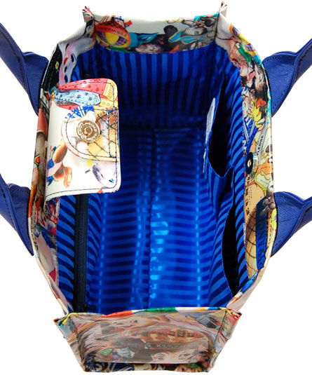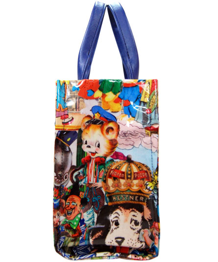 シーズンテーマに合わせたオリジナルプリント生地のバッグ。赤、ブルー、白のカラーが散りばめられたコラージュは、フランスの国旗のトリコロールのイメージ。 そして、手紐のブルーと内装のストライプ生地に使われたブルーとのコントラストが絶妙なコンビネーションです。 プリント生地には、表面にビニールコーティングされていますので、多少の雨にも強いです。軽量で使い易いタイプです。