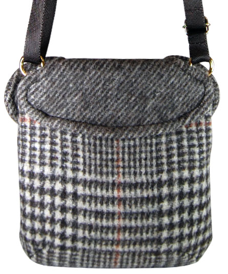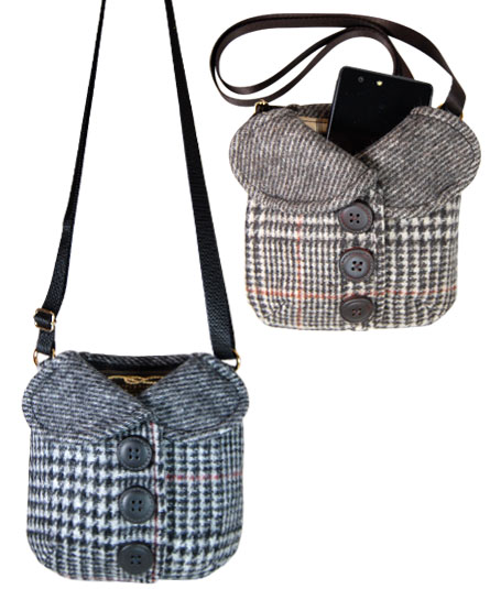 チェックのツイードのジャケットを思わせるデザインが可愛らしいデザイン。内装は、それに合わせてストライプのシャツのイメージの生地で作られています。 また、革のくるみボタンがトラディショナルな雰囲気を一段と醸し出しています。