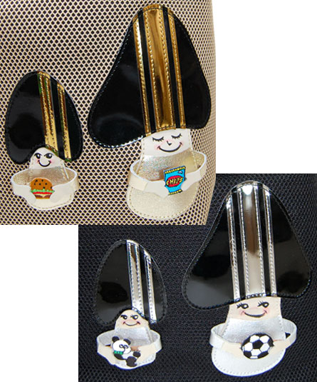 メッシュの本体に、きのこのモチーフが二体パッチワークされたキャッチ―でスポーティーなイメージのバッグ。 黒のバッグへ付いたきのこが持っているのは、サッカーボール。そして、ベージュのバッグへ付いたきのこが持っているのは、ハンバーガーとスナック菓子になります。 そのイメージとしては、フランスのサッカーチームとそのオーディエンスです。きのこの顔部分は、手描きの為、一つ一つ異なりますので御了承下さい。