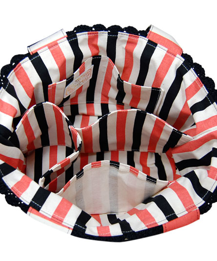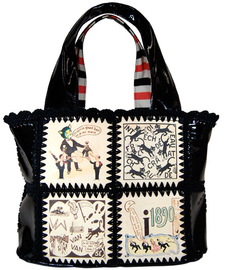 小さな正方形の革に、古いフランスのグラッフィックがプリントされた、レトロな雰囲気の温かみのあるバッグ。 それぞれの正方形の革を、日本人の熟練の職人さんが手編みで袋に編み上げた、手の込んだデザインになります。 黒のバッグは、モノクロ調の猫(シャノアール)のグラフィック、カラーの方は、アルファベット(サバ!)や、幼児語(べべ、ドゥ―ドゥ―)のグラフィックプリントになります。 内装は、サーカスのテントを思わせるストライプ生地を使い、モノクロバッグには、コーラルピンク×黒、カラーの方は、ブルー×黒のストライプが使用されています。