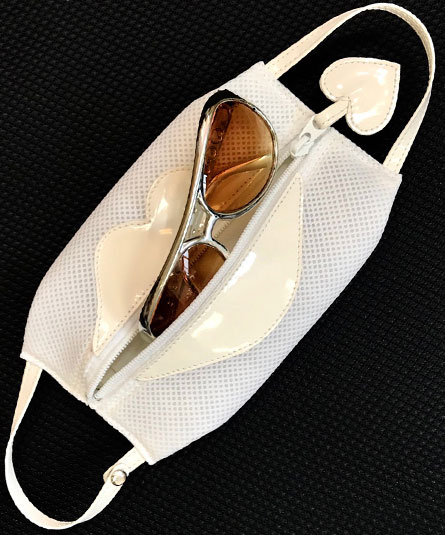 コロナ禍企画。マスクの形がユニークなポーチ。保管用のマスク入れ用(20~30枚収納可)として、また他にお化粧品、ハンドジェル、サングラス、携帯、ステーショナリー等、様々に使用できます。手紐に、ホックが付いていますので、取り外して、バッグや他の物へ下げて使用出来ます。洗濯可。