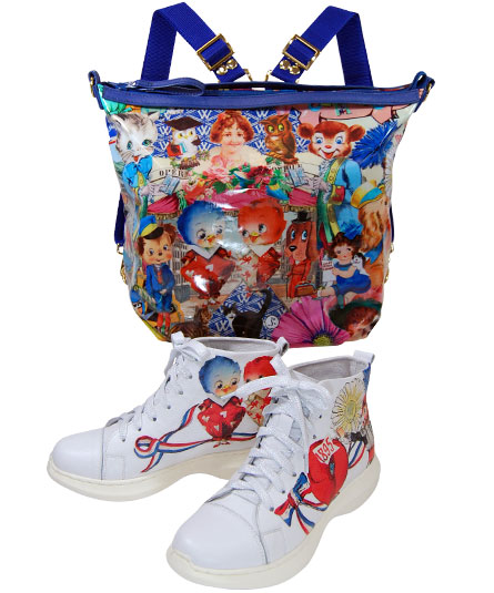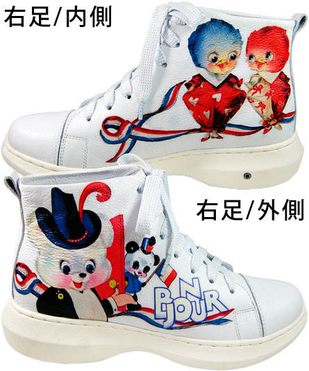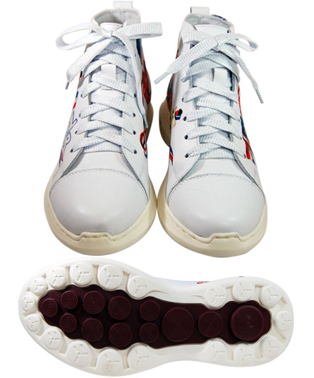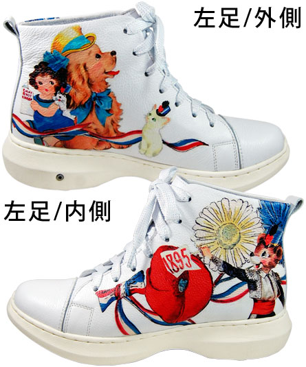 小さな子供が、履く靴の大人版のイメージ バッグシリーズで人気のコラージュプリントをハイカットスニーカーで表現しました。 左右足の内外でプリント柄が異なる遊び心のあるユニークなデザイン。 バッグとコーディネートをして、更にアップグレードした装いをお楽しみ下さい。 ソールに空気循環機能付いているので、歩く度に空気が靴の中を循環し、歩行時の衝撃の緩和と湿気を軽減します。