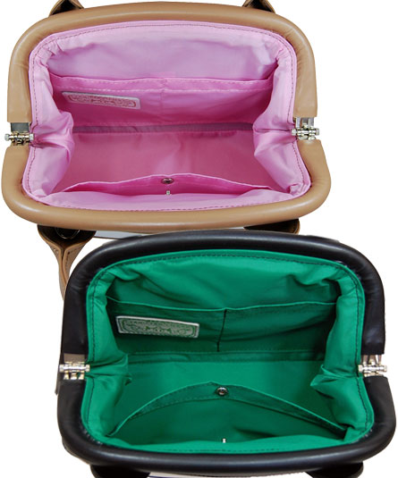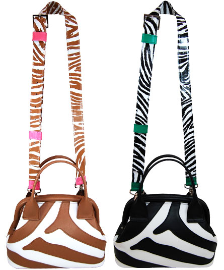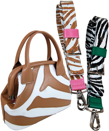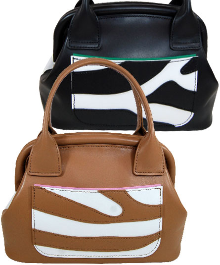 ケニアのサバンナの平原から想起された、ゼブラの縞模様を革でパッチワークしたバッグ。手紐のゼブラプリントとのコンビーネーションが絶妙なバランス。内装のピンクとグリーンのカラーがアクセントポイントとして効いています。短めの斜め掛けすると、トレンディーな雰囲気になります。