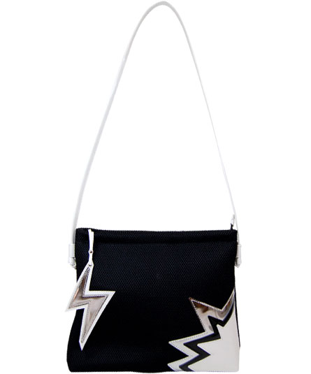 スニーカー等で使われているスポーツ素材のメッシュを使ったシリーズ。本体の右側コーナーの稲光のようなパッチワークが、インパクトのあるデザイン。軽量で持ちやすいタイプ。
