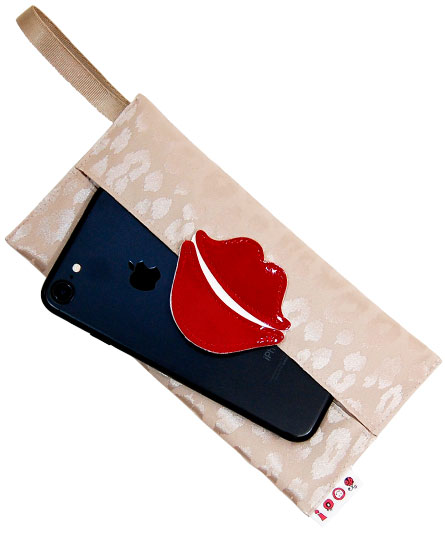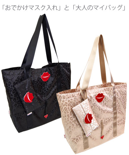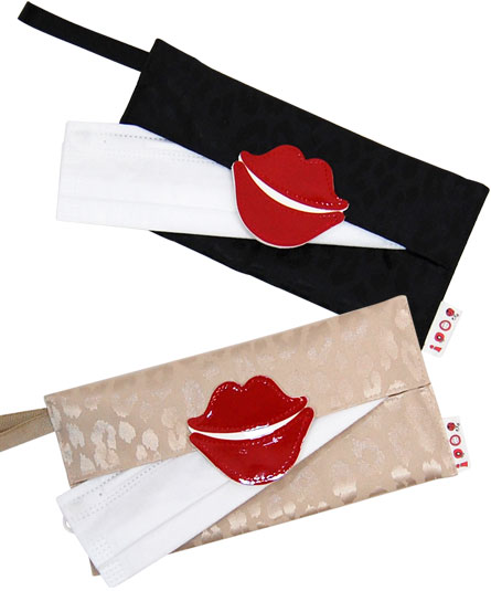 「おでかけマスク入れ」は、コロナ禍において食事の際などに、マスクを外す時に一時的な保管用として企画した商品です。市販の不織布製のマスクの内臓の針金を曲げずに収められます。マスクの他に、携帯、消毒用ハンドジェル、携帯などを入れて使用出来ます。中央の唇モチーフ部分には、ホックが付いています。テープの部分にも、ホックが付き、取り外しが出来ます。「大人のマイバッグ」とコーディネートしても映えます。