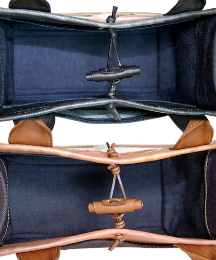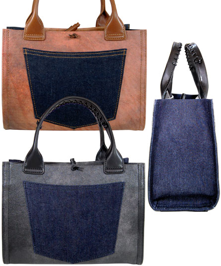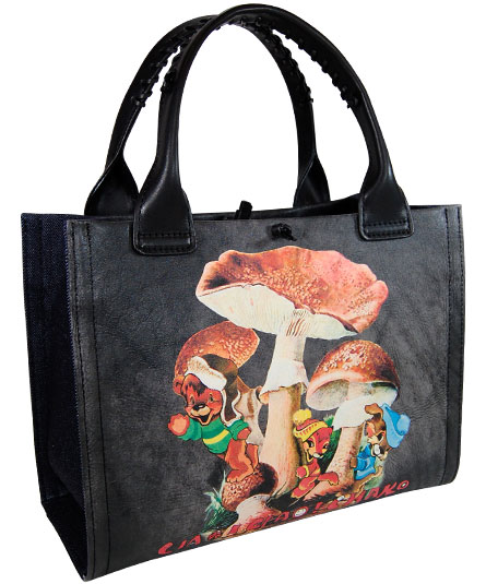 持ち易い中ぶりのトートバッグ(A4サイズのファイル収納可)本体は、ヴィンテージの革の上にきのこと可愛い動物のイラストが描かれたように見える、だまし絵風のプリント革になります。 ヴィンテージ革独特の古びて使い込んだ感じの革キズやシワや汚れが、プリントによって表現された遊び心がユニークなレトロ感のあるバッグ。 手紐のグリップ部分は、革紐で手かがりで止められています。 マチ部分は、デニム素材になります。背ポケット付き。内装の前後にポケット二つ付き