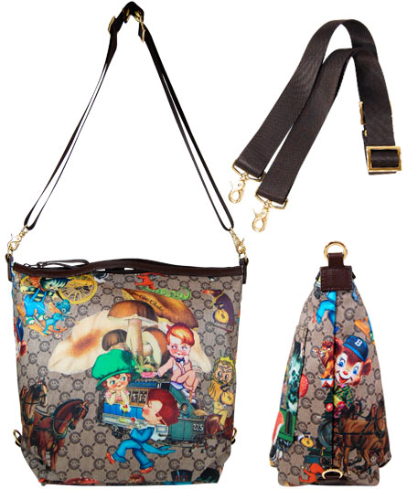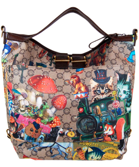 3WAY、提げ手として、また、手紐を付け替えて、ショルダーから、リュックになります。 シーズンテーマに合わせたオリジナルプリントシリーズ。 ベースのモノグラムパターンの上に、馬車や汽車に乗った動物や小人ときのこなど様々な可愛いらしいイラストが楽しく目を惹くバッグ。 手紐は、ブラウンの型押し革ですっきり纏められています。 プリント生地には、表面にビニールコーティングされていますので、多少の雨にも強いです。軽量で使い易いタイプです。 背ポケット付き。天ファスナー付き。内装の前後に二つポケット付き。 プリントの柄域は、裁断の状況により画像とは異なりますので御了承下さい。