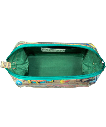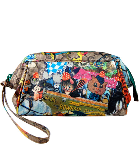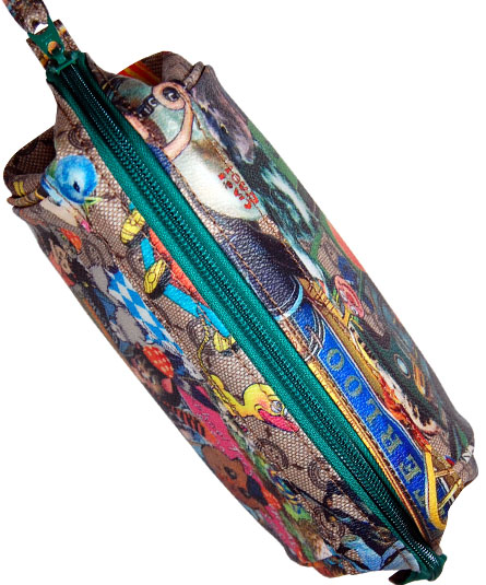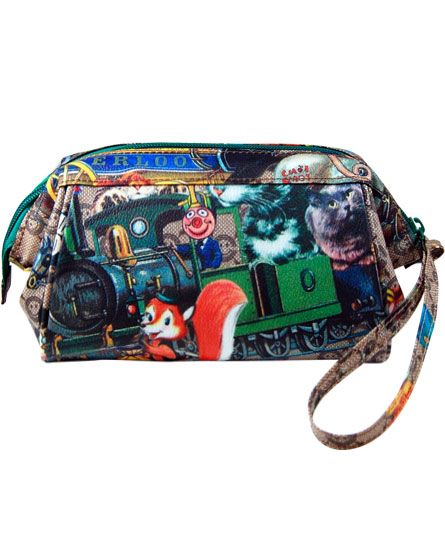 ボストン型のポーチ。開閉部にワイヤーが入っていますので大きく口開きして使い勝手が良いタイプ。お化粧ポーチ等の小物入れとして最適です。 ファスナーの引手部分は、腕が通る長さなので、持ち運びに便利。 シーズンテーマに合わせたオリジナルプリントシリーズ。 ベースのモノグラムパターンの上に、馬車や汽車に乗った動物や小人ときのこなど様々な可愛いらしいイラストが楽しく目を惹くバッグ。 手紐は、ブラウンの型押し革ですっきり纏められています。 プリント生地には、表面にビニールコーティングされていますので、多少の雨にも強いです。軽量で使い易いタイプです。 内装に一つポケット付き。プリントの柄域は、裁断の状況により画像とは異なりますので御了承下さい。