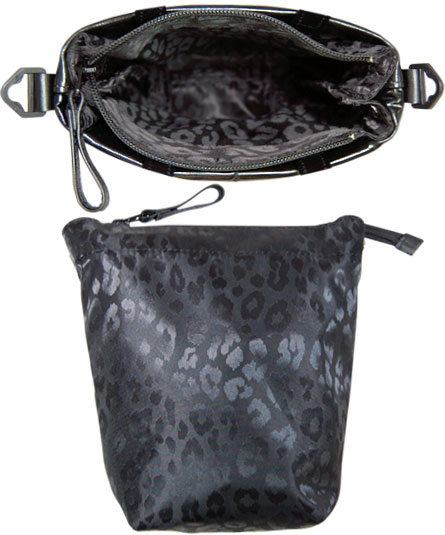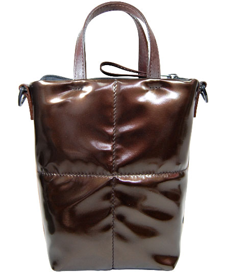 人気の縦長ミニショルダー 前側は、革に液体がこぼれ流れ出したプリントを施したデザイン。後ろ側は、光沢感のあるウレタン素材にクロスにキルティング。 ペンキ?チョコレート?よだれ?色々とイメージが膨らむ楽しいバッグ。唇チャームや、吹き出し型のチャームと合わせると更に個性的なイメージに変身。 豹柄ジャガード生地の天ファスナー付きの内装のポーチ(当社の長財布が縦に収納可)は、取り外し可能。 手紐ショルダー取り外し可能。内装の前後に二つポケット付き。