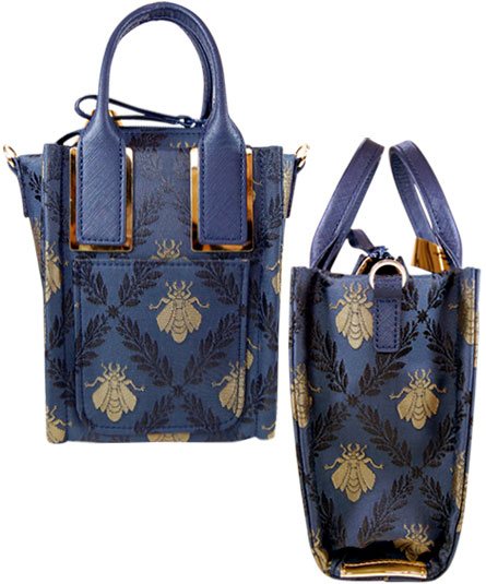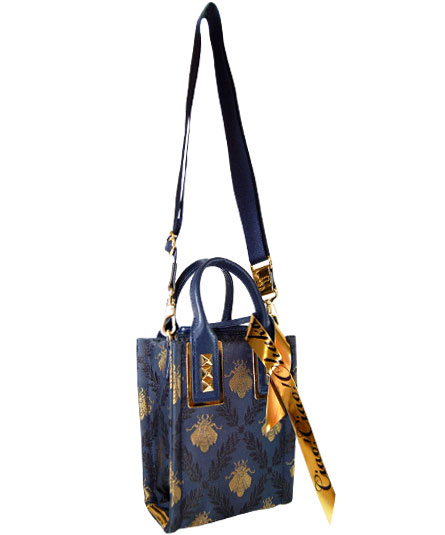 トレンドの小ぶりなショルダー&トートバッグ クラシカルな蜂のジャガード織りの生地を使ったシリーズ。 手紐込止め部分のスタッズ鋲とゴールドメタリック素材がアクセントとして目を惹くデザインです。 内装は、それぞれのメタリックカラーが使われていて細部までこだわのある仕様になっています。 背ポケット付き。天ファスナー付き。手紐ショルダー取り外し可能