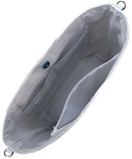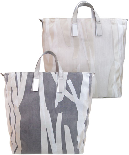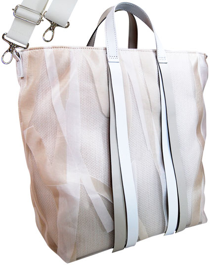 縦長の大ぶりトート。 本体まで伸びた二本の手紐が揺れて、ストライプ模様と一体となって風に揺れているようなデザイン。 表面はジャガード生地と透け感のあるレース生地との二層構造の仕立てになっています。 従って、本体生地からストライプ模様が透けているのがポイント。 内装にマグネット付き。手紐ショルダー取り外し可能。内装の前後にファスナー付きポケットと仕切り付きポケット。