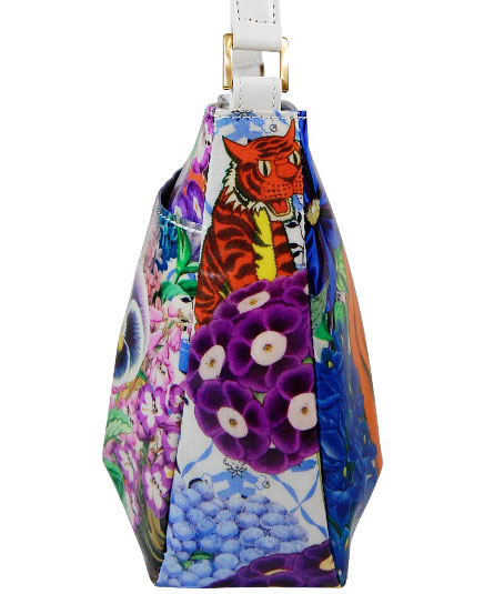 長財布の入るポシェットバッグ。背ポケット付き。天ファスナー付き。内装の前後に二つポケット付き。 シーズンテーマに合わせたオリジナルプリントシリーズ。 様々なブルーの花々の中に見え隠れするリラックスした様子の動物や人物のイラストがボタニカルイメージ。さらに、手紐の白革とのコンビが爽やかな印象 プリント生地には、表面にビニールコーティングされていますので、多少の雨にも強いです。軽量で使い易いタイプです。