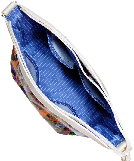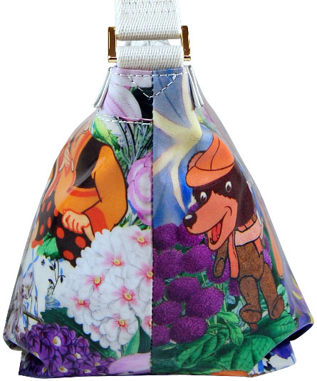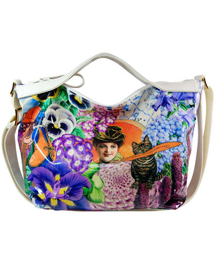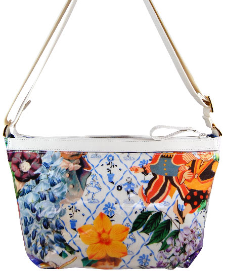 マチ幅が有りお弁当箱等がスッポリと収まるサイズのショルダー&提げ手バッグ。背ポケット付き。天ファスナー付き。内装の前後に二つポケット付き。 シーズンテーマに合わせたオリジナルプリントシリーズ。 様々なブルーの花々の中に見え隠れするリラックスした様子の動物や人物のイラストがボタニカルイメージ。さらに、手紐の白革とのコンビが爽やかな印象。 プリント生地には、表面にビニールコーティングされていますので、多少の雨にも強いです。軽量で使い易いタイプです。