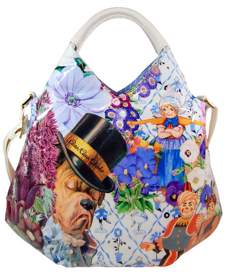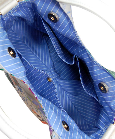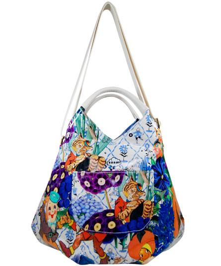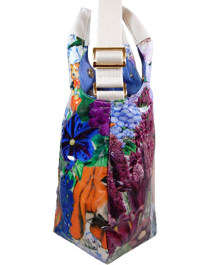 縦長の丸みのある可愛いデザインのショルダー&提げ手バッグ。背ポケット付き。内装に2つのマグネット付き。内装の前後に二つポケット付き。 シーズンテーマに合わせたオリジナルプリントシリーズ。 様々なブルーの花々の中に見え隠れするリラックスした様子の動物や人物のイラストがボタニカルイメージ。さらに、手紐の白革とのコンビが爽やかな印象。 プリント生地には、表面にビニールコーティングされていますので、多少の雨にも強いです。軽量で使い易いタイプです。