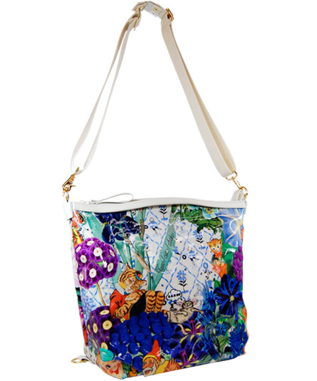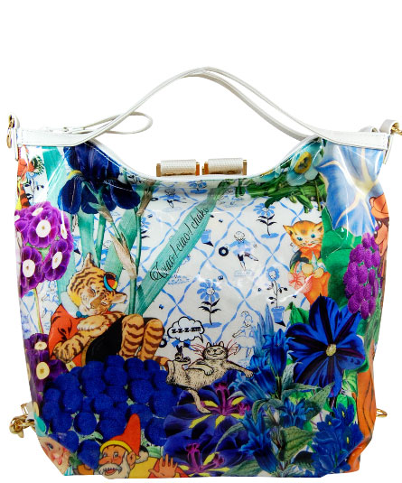 背ポケット付き。 天ファスナー付き。 3WAY、提げ手として、また、手紐を付け替えて、ショルダーから、リュックになります。内装の前後に二つポケット付き。 シーズンテーマに合わせたオリジナルプリントシリーズ。 様々なブルーの花々の中に見え隠れするリラックスした様子の動物や人物のイラストがボタニカルイメージ。 さらに、手紐の白革とのコンビが爽やかな印象。 プリント生地には、表面にビニールコーティングされていますので、多少の雨にも強いです。軽量で使い易いタイプです。