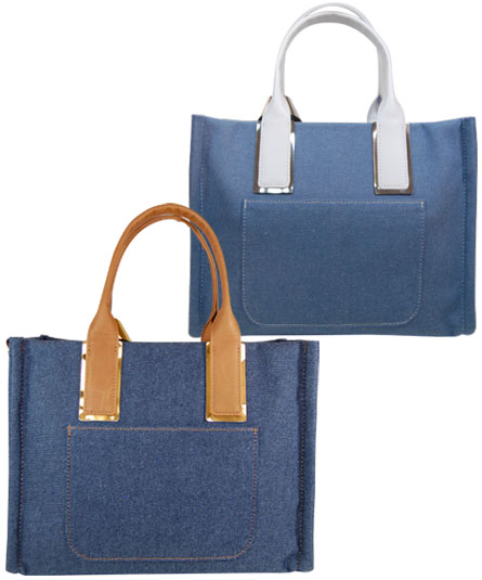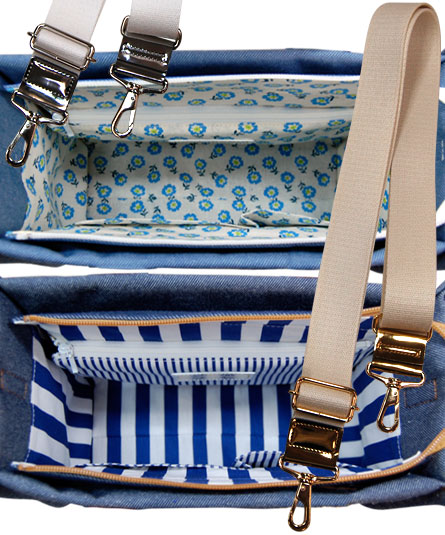 使い易いサイズのショルダー&トートバッグ背ポケット付き。天ファスナー付き。手紐ショルダー取り外し可能。内装の前後に二つポケット付き。 デニム調の生地の本体に手紐止め部分のスタッズ鋲。そして、ゴールド、シルバーのメタリックカラーがアクセントとして目を惹くデザインです。 ライトブルーの内装は、小花模様、そして、ダークブルーの内装は、ストライプ模様とが使われていて細部までこだわのある仕様になっています。