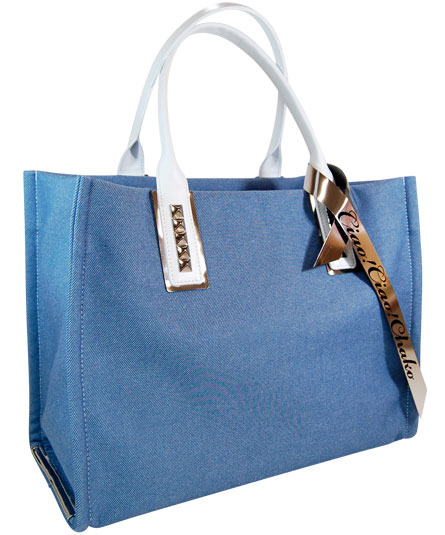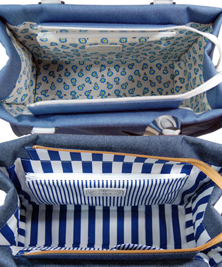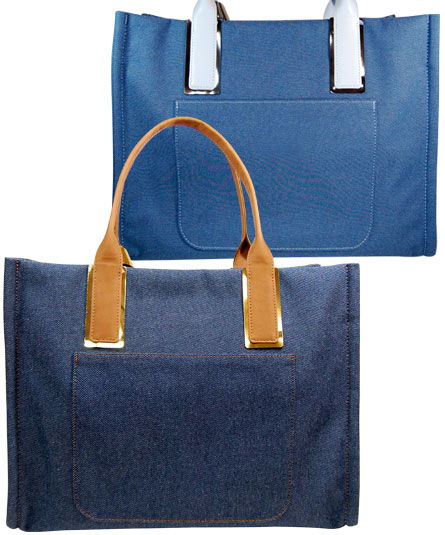 収納力のある大振りのトートバッグ。背ポケット付き。天ファスナー付き。内装の前後に二つポケット付き。 デニム調の生地の本体に手紐止め部分のスタッズ鋲。そして、ゴールド、シルバーのメタリックカラーがアクセントとして目を惹くデザインです。 ライトブルーの内装は、小花模様、そして、ダークブルーの内装は、ストライプ模様とが使われていて細部までこだわのある仕様になっています。