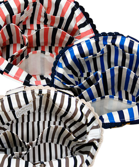 使い勝手の良いサイズの大振りトートバッグ。 内装は、仕切りが多くA4ファイル、お弁当や、ドリンクボトルも入る機能的な作りになっています。 正方形の革に、可愛らしいグラッフィックがプリントされた、レトロな雰囲気のバッグ。 それぞれの革を、日本人の熟練の職人さんが手編みで袋に編み上げられた、手の込んだデザインになります。 黒のバッグは、モノクロ調の猫(シャノアール)のグラフィック、ブルーは、アルファベット(サバ!)のグラフィックプリントになります。 そして、新柄のベージュは、犬のイラストになります。 内装は、サーカスのテントを思わせるストライプ生地を使い、黒のバッグには、コーラルピンク×黒、ブルーの方は、ブルー×黒のストライプが使用されています。 そして、新色のベージュは、黒×こげ茶のストライプです。 プリント革部分は、日本の革加工業者で製造のオリジナル素材です。