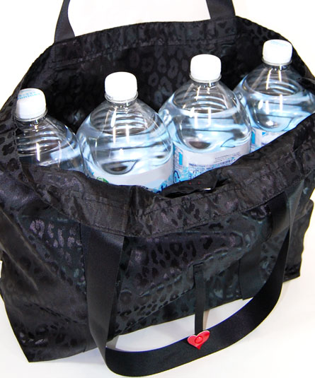 今シーズンより、猫のモチーフが新たに登場です!! 「大人のマイバッグ」は、レジ袋有料化に伴い企画した時流感のあるバッグ。 本体の豹柄は、日本製のジャガード織生地、織の陰影とシルクのような光沢感が美しく高級感があります。 唇のポイント部分が、ホック止めの仕組みになって、折りたたむ際に留め具になっています。 折り畳むと、コンパクトになり手持ちのバッグへ携帯出来ます。使用時は、2リットルのペットボトルが4本入るサイズです。
