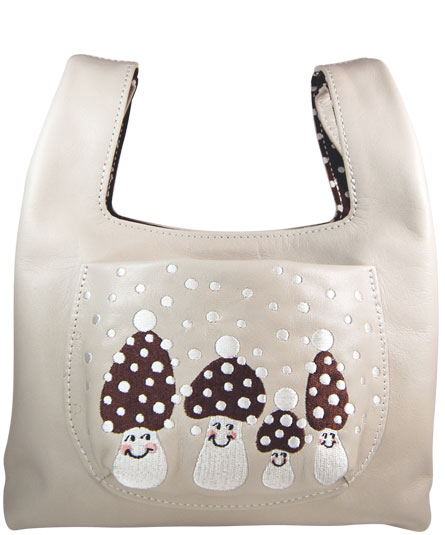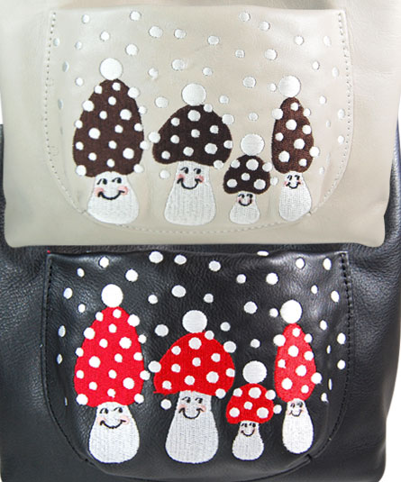 前面ポケット部分へ、きのこの水玉なのか?雪模様なのか?降りしきる雪の中に可愛いきのこの刺繍が施されています。