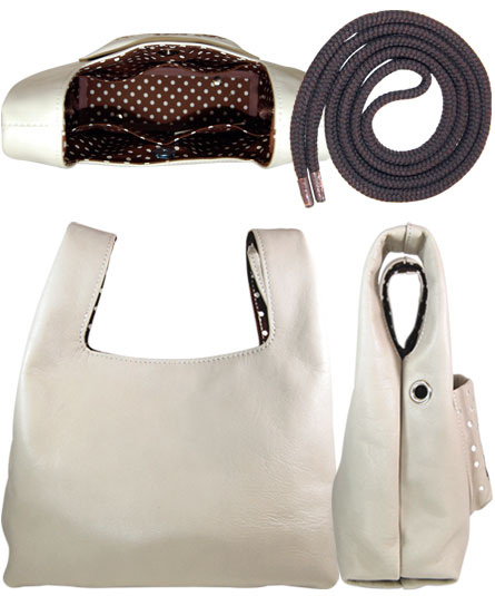 ショッパーバッグを思わせるフォルムの提げ手に、マチ部分へ組み紐のショルダー付き(取り外し可能)2WAYタイプ。