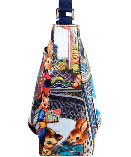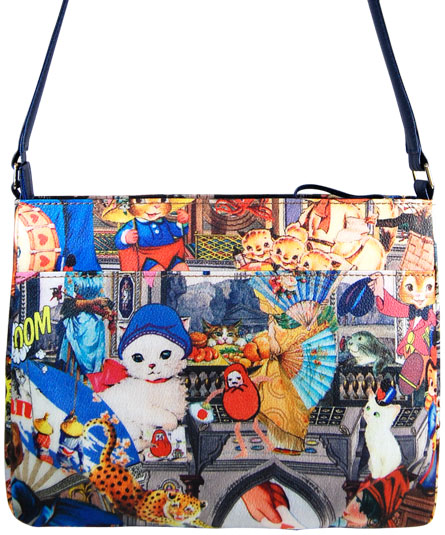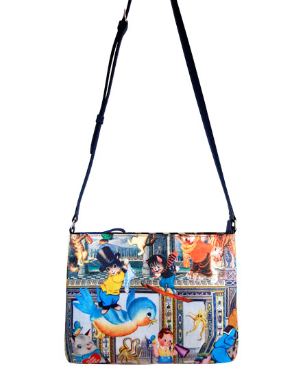 その中で子供や動物のキャラクターが楽し気に過ごす姿をコラージュしたファンタジックな世界が広がるプリントです。