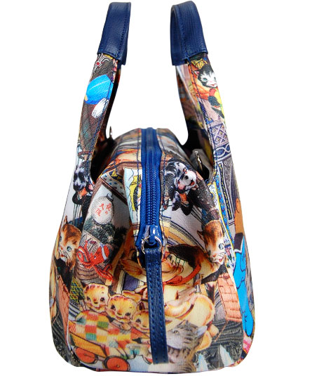 ブルーを基調としたプリント柄と、内装や手紐等の付属材料のブルーが、全体のアクセントカラーとして効いています。