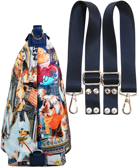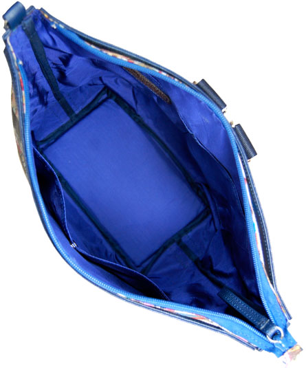 ブルーを基調としたプリント柄と、内装や手紐等の付属材料のブルーが、全体のアクセントカラーとして効いています。