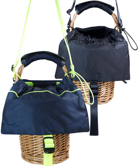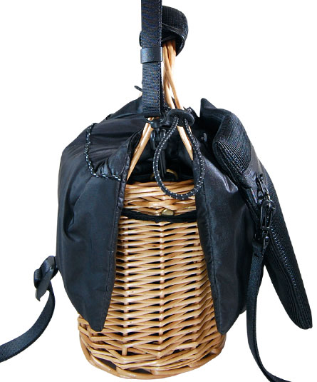 縦長の柳のカゴへ綿入りの薄手のナイロン生地のカブセを付けた冬用のカゴの提案です。