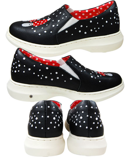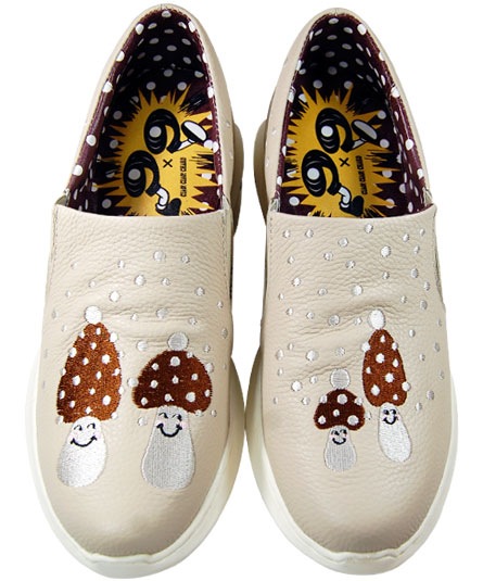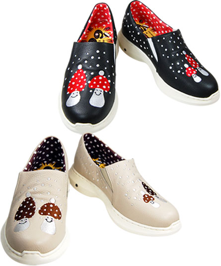アッパー部分へ、きのこの水玉なのか?雪模様なのか?降りしきる雪の中に可愛いきのこの刺繍が施されています。