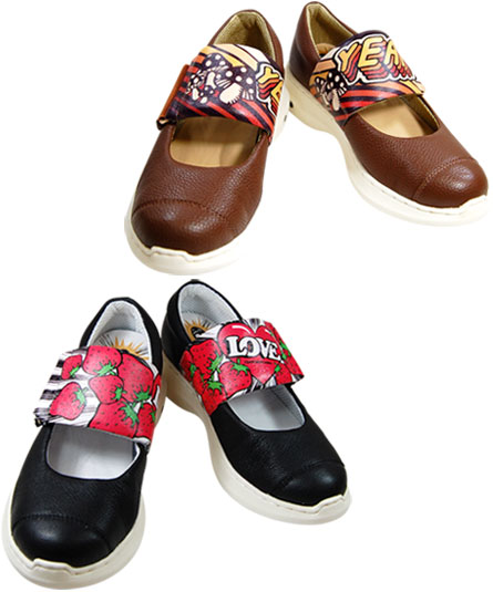 黒には、いちごと LOVE の文字のイラストが、茶にはきのこと YEAH の文字のイラストが牛革へプリントされています。