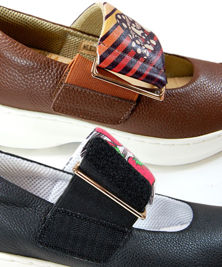 ストラップ部分にゴムが付いていますので、金具を外さずに脱ぎ履きが出来ます。