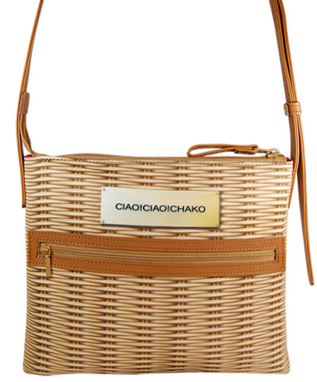 シルクタッチのスカーフの様な生地に籠のだまし絵風のプリントがユニークなショルダーバッグ。