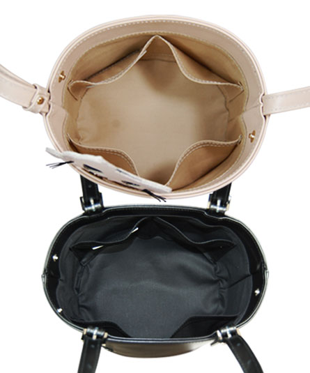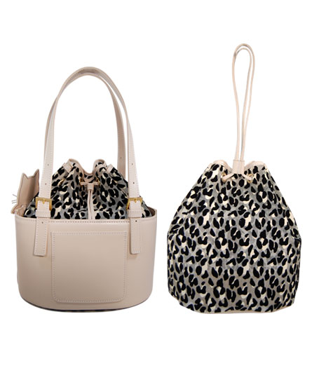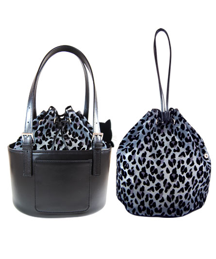 本体は牛革製のバケツ型提げてタイプ、その中に豹柄チュール巾着袋が収まっています。